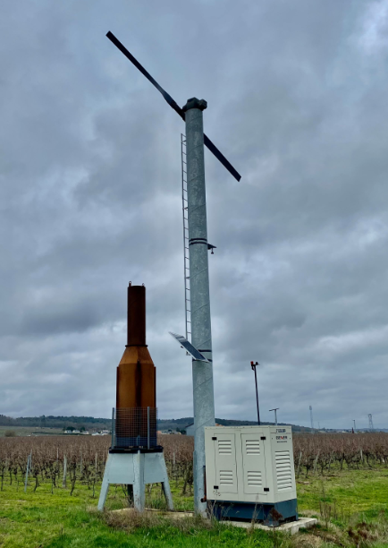Alors, ils taillent les vignes plus tard pour retarder le débourrement. Pour faire face au gel printanier, la CUMA Bourgueil Environnement Lagune (BEL), un groupement des vins de Bourgueil, a réuni des investissements. Les dispositifs individuels étant devenus trop coûteux pour les exploitations, la démarche collective est apparue évidente. Le syndicat a depuis cinq ans investi dans une trentaine d’éoliennes atypiques. En arrivant dans le village, on s’interroge sur ces drôles de pylônes en fer surplombant les vignes. Soutenue économiquement par l’Etat pour une installation d’une telle ampleur, cette technologie est une aubaine pour les viticulteurs du village. En cas de risque de gel, une fois les bourgeons débourrés, les éoliennes, avec l’accord du syndicat, sont activées : elles projettent du fuel, brassé par les hélices répartissant la chaleur sur environ trois hectares. Ces infrastructures créent un microclimat au-dessus de Saint-Nicolas-de-Bourgueil, écartant le risque de gel. Il arrive toutefois que certains voisins rouspètent. Guilhem Vallée, amusé, témoigne, “Mes grands-parents habitent dans le village et peuvent se plaindre du bruit des éoliennes pendant la nuit !”. Il en profite pour détailler d’autres méthodes pour lutter contre le gel du bourgeon tel que l’aspersion d’eau, gelant le bourgeon, qui est conservé par le froid, sans risquer de mourir.